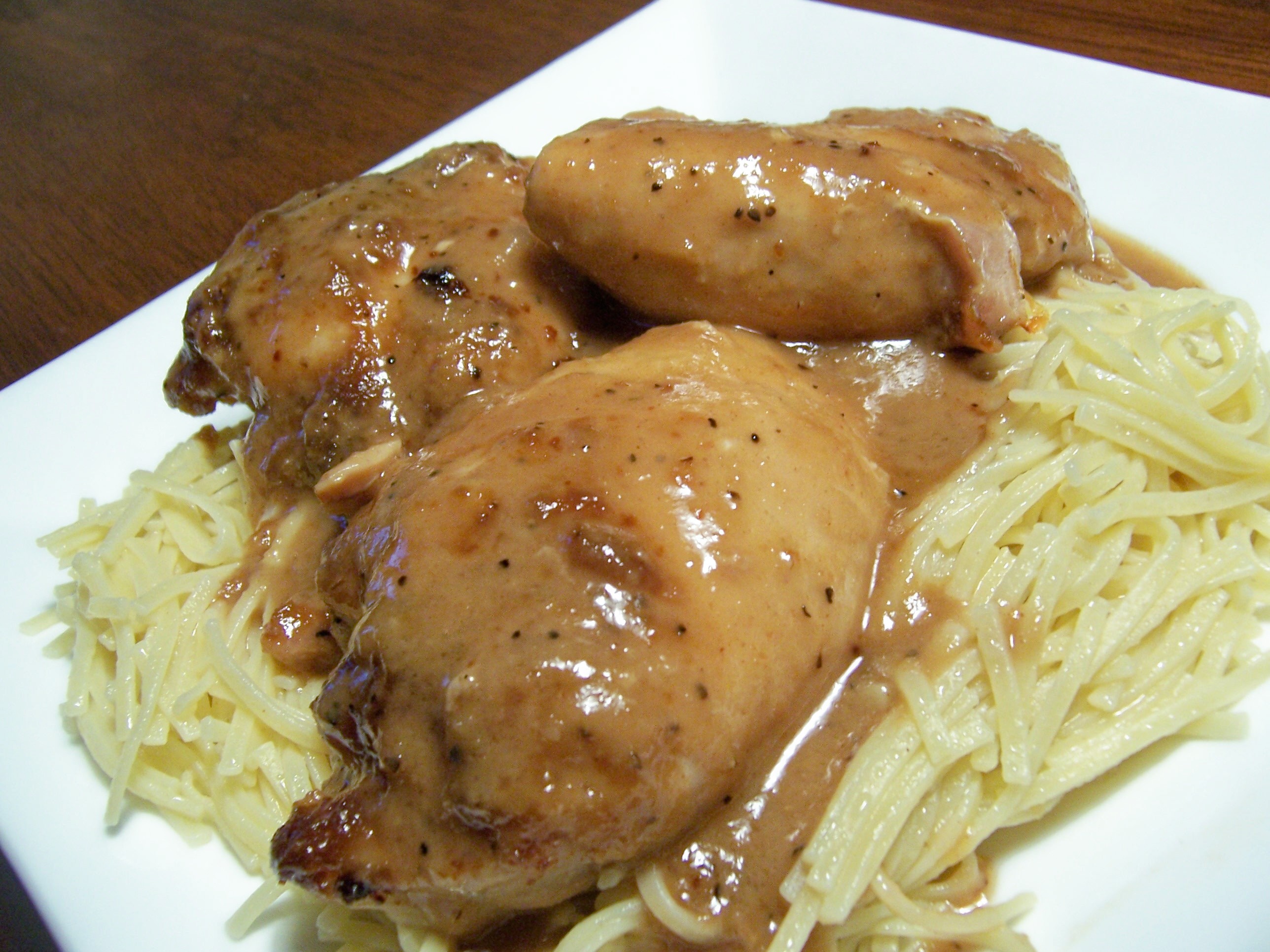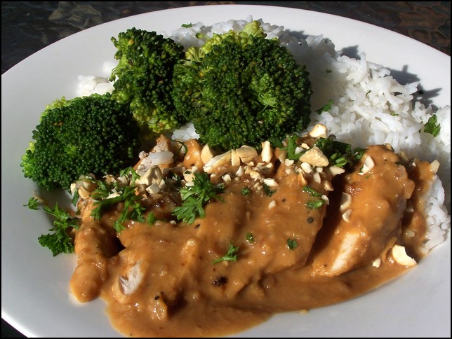 3 1?2 lbs boneless skinless chicken breasts 1?3 cup peanut butter 2 tablespoons soy sauce 2 tablespoons orange juice 1?4 teaspoon pepper 1 -2 tablespoon honey (optional) 1?2 - 1 cup chicken broth (optional)